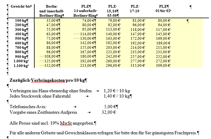 Für alle anderen Gebiete und Gewichtsklassen erfragen Sie bitte den für Sie günstigsten Frachtpreis.